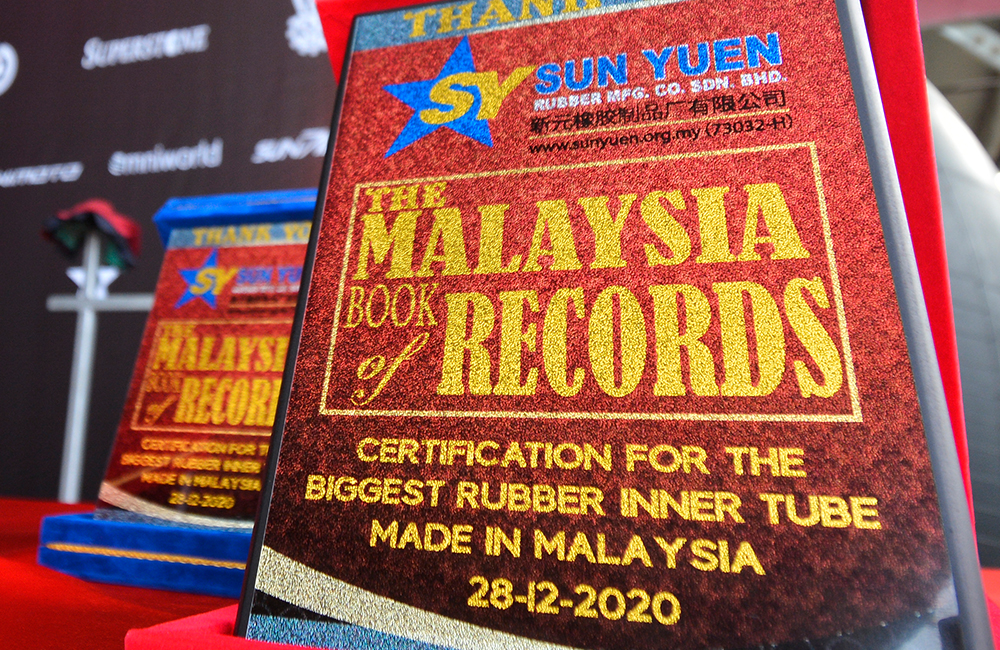 On the 28th of December 2020, Sun Yuen Rubber was awarded by Malaysia Book of Records (MBR). The award ceremony was witnessed by President of Perak Chinese Chamber of Commerce and Industry (PCCCI); CEO of Invest Perak; Director of Ministry of International Trade and Industry (MITI) Perak; President of Federation of Malaysia Manufacturers (FMM) Perak. Representatives from MBR Mr. Aaron Bong and Puan Siti Hajar evaluated and confirmed that the tube was in fact the biggest ever produced in Malaysia.